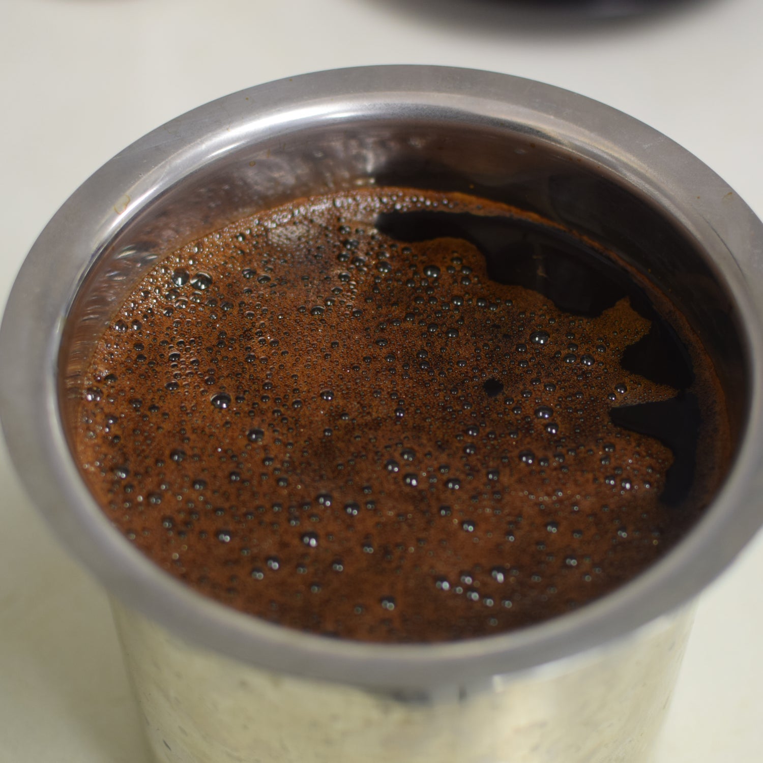 Indian filter coffee brewing uses a fine grind size. The coffee grounds steep in water for longer and drips slowly to yield a concentrated brew.