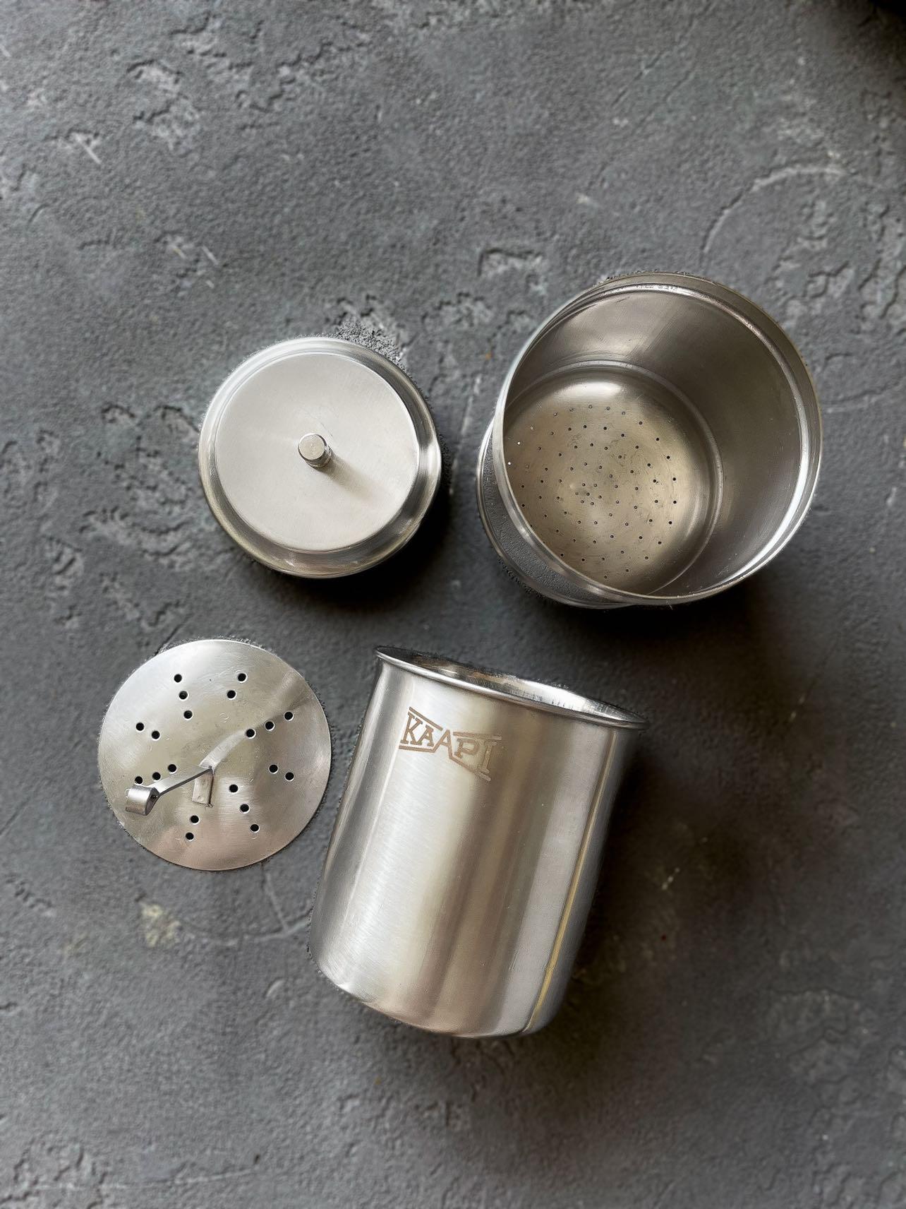 This traditional Indian coffee brewer comprises two stainless steel/brass chambers assembled one on top of the other. The top chamber has tiny perforations which acts as the fixed filter. This chamber also houses a plunger to tamp and hold down the coffee grounds. This contraption is simple yet effective. The filter pot doesn't use any non-metal or consumable parts like rubber gaskets, making it last a lifetime.